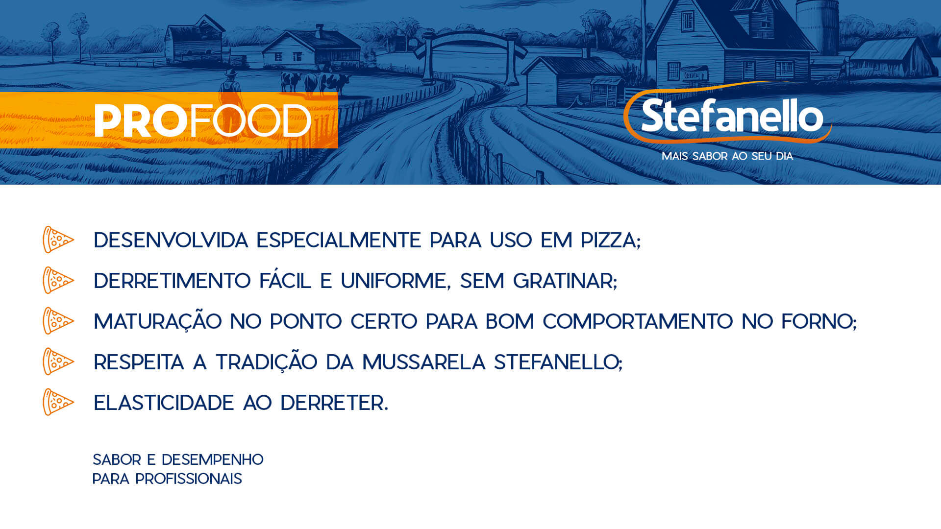 Respeitando a tradição da mussarela Stefanello, a PROFOOD entrega equilíbrio entre sabor, rendimento e comportamento térmico, oferecendo mais segurança e previsibilidade no preparo.